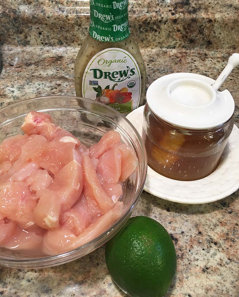 The marinade ingredients are simple: Italian Dressing, Honey, and Lime Juice. Fresh works best, but I will admit to have used the bottled stuff from time to time…