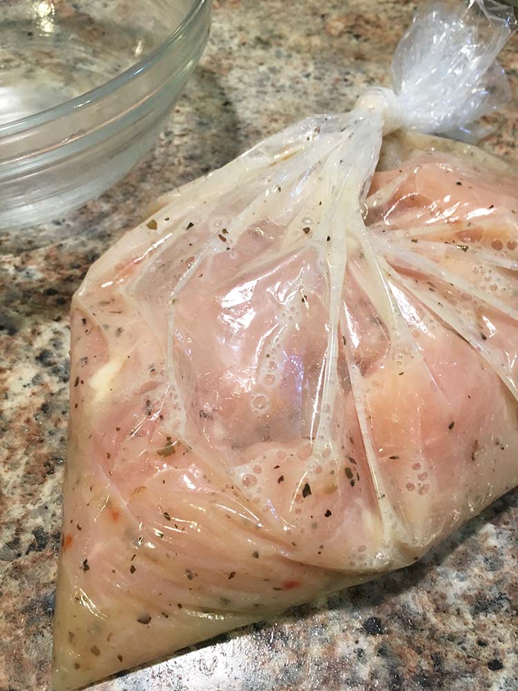 Mixing the marinade ingredients in a disposable bag will make clean up a lot easier. I put the ingredients in the bag then squish (technical term) them around to mix. Add your chicken and make sure it is coated, then tie the top and put it in the fridge to marinate.
