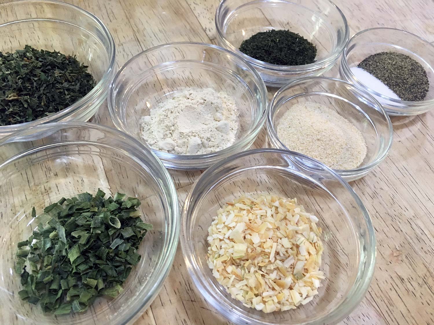 To make the dip mix, just blend all the ingredients together. If you want the ingredients finer you can grind them in a mortar and pestle, but it is not necessary.
