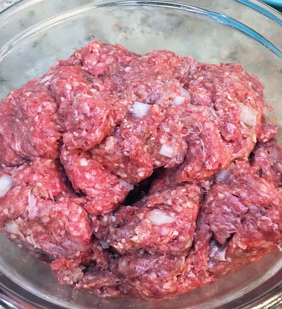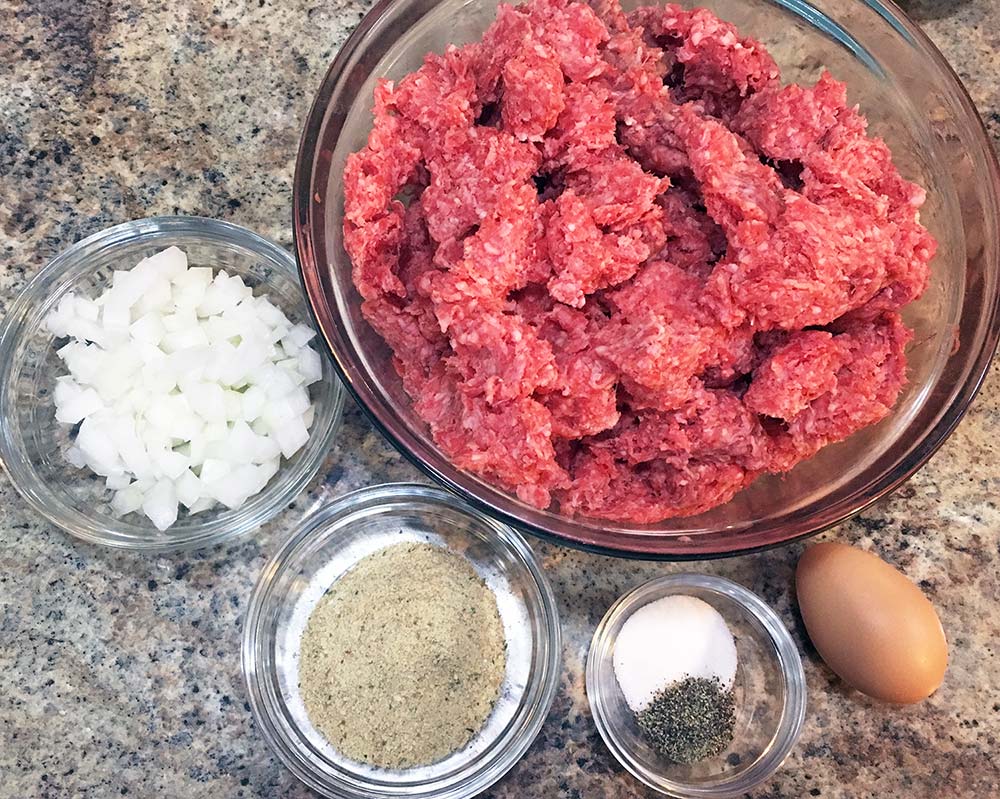First you’ll need your ingredients: ground beef, onion, bread crumbs, egg, salt, and pepper. Very simple ingredients to create something very tasty!