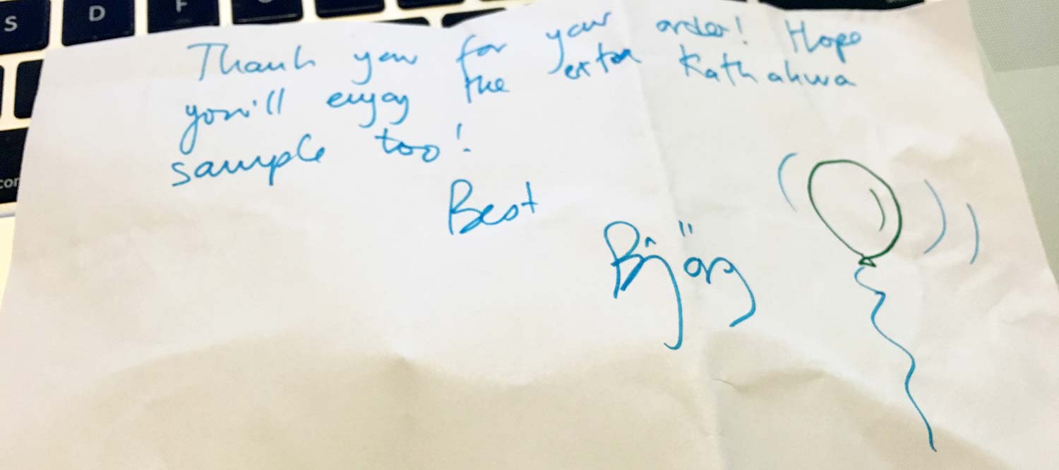 This coffee was all about the presentation. The bags are custom printed foil (inside and out). The coffee ordered was Alto De La Cruz. They also sent a sample of Kathakwa and a handwritten note.